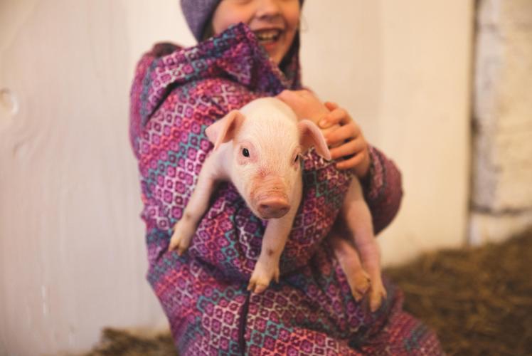 While you are here you can learn more about our animals from our staff or by reading all the signs up around the barn. It may even be possible to witness a birth while you are here. Some of the animals to see include sheep, lambs, pigs, piglets, goats, kids (baby goats), chicks, alpacas and ponies. Our motto is, if it fits in your lap, we will help you hold it. There are pony rides and giant slide (weather permitting).
