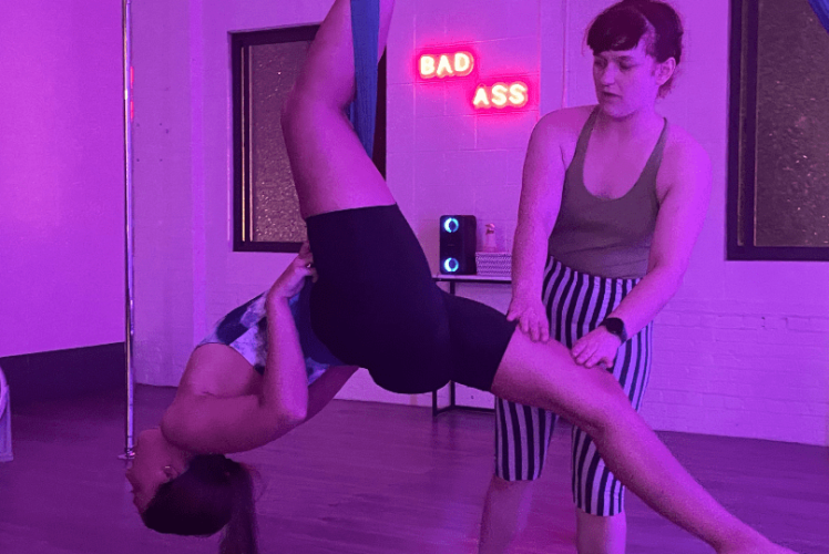 An intro to aerial class at Moonrise Aerials and try aerial hammock, silks, and lyra. Aerial dance originates from circus arts and incorporates acrobatics on an apparatus attached to the ceiling.