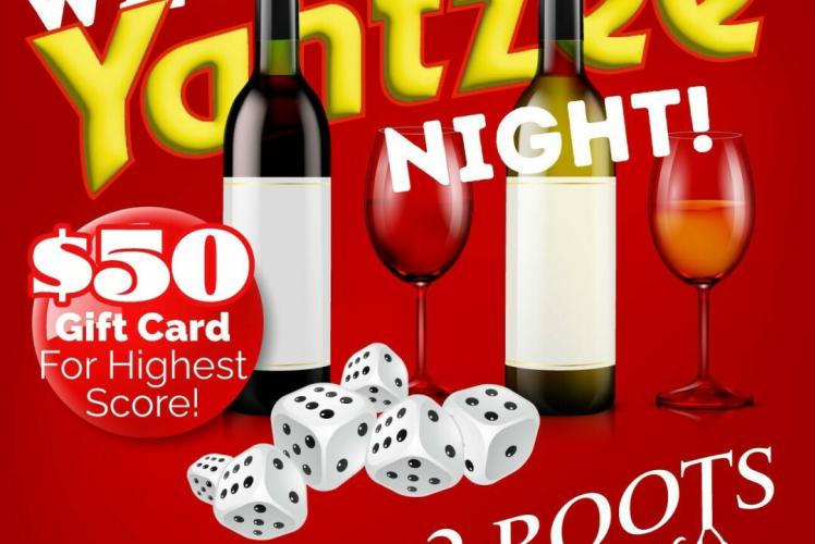 Gather for wine and Yahtzee. Highest score of the night wins a $50 gift card.