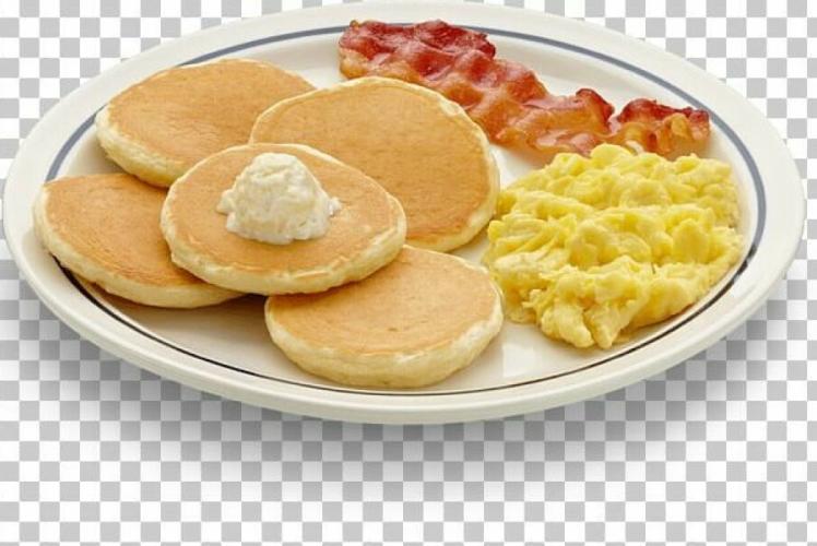 Pancakes, Scrambled Eggs, Bacon, Sausage, Hashbrowns, Coffee, and Milk